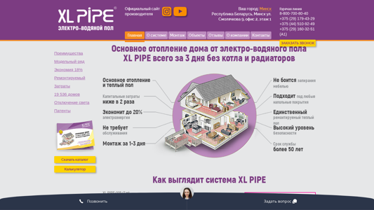 | AI-анализ | The web project "Отопление дома от эlectro-водяного пола XL PIPE" located at kostanay.xlpipe-belarus.by is dedicated to selling and installing electro-hydronic underfloor heating systems in the Belarusian cities listed, including Minsk. The main selling points are quick installation within 3 days without a boiler or radiators, lower capital costs, energy savings up to 20%, no maintenance, and a long service life of over 50 years. The underfloor heating system, XL PIPE, is a pipe system with a diameter of 20mm made of high-strength polyethylene and containing liquid and heating cable inside. It is supplied in nine lengths from 7 to 84 meters and can heat areas from 3 to 25 square meters. Multiple systems can be installed in |