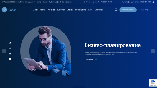 | AI-анализ | The website is for the investment consulting company ASER located in Minsk, Belarus. The company offers a full range of services in the field of business planning, financing acquisition, research and analysis in Belarus. The address is Pr-t. Jukov 29, 5 etazh, office 8 (BC "Krasavik") with working hours from Monday to Friday, 9:00-18:00 and the phone number for contact is +375 29 399 91 90. The company specializes in business planning, leading the Belarusian market in the number of business plans developed annually. They conduct marketing research for large international corporations and organizations. They specialize in securing financing for Belarusian and foreign banks and investment funds. Every tenth company entering the High Technology Park in Belarus comes to them with |
