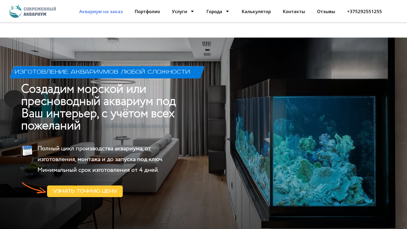 | SEO-описание | Дизайнерские аквариумы на заказ, работаем по всей РБ ✔️ Гарантия 3 года ✔️ Бесплатный дизайн проект ✔️ Собственное производство ✔️ Обслуживание после установки |