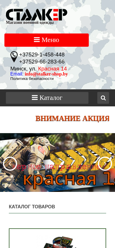 Проект "Сталкер" представляет собой онлайн-магазин военной одежды и снаряжения. Меню разделено на разделы: домашняя страница, контакты, оплата, доставка, каталог, военная форма. Каталог включает в себя различные категории, такие как термобелье, камуфляжная одежда, головной убор, жилетки и куртки. Также представлены разделы с ботинками, рюкзаками, поясками и нижней одеждой. В магазине можно найти военные символы, знаки различия формы, а также аксессуары. На сайте указаны номер телефона и электронная почта для службы поддержки клиентов, а также информация о политике безопасности. Каталог включает в себя товары, такие как оригинальные штанцы ACU, военная форма Bundeswehr, трусы DDPM, все цены указаны в рублях. Сайт расположен в Минске, Беларусь.