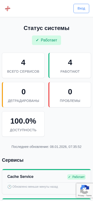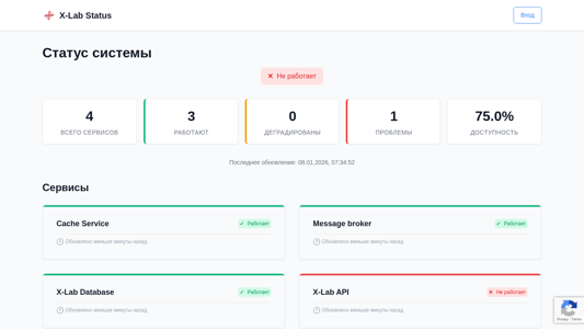 | AI-анализ | Проект веб-сервиса X-Lab Status Service представляет собой платформу мониторинга статуса различных сервисов с названием "X-Lab Status" и доменным именем "status.x-lab.by". Описание проекта указывает на "статус служб X-Lab", что в английском переводится как "X-Lab service status". Сайт предоставляет информацию о статусе нескольких сервисов, используя ключевые слова "status" и "service". По данным, всего насчитывается три сервиса, из которых все работают, при этом один имеет ухудшенный статус. Проблемы, влияющие на доступность сервисов, составляют 75.0%. Последнее обновление сайта было зафиксировано 8 января 2026 года в 7:34:52. Список включает в себя Cache Service, Message broker, X-Lab Database и X-Lab API. Cache Service и Message broker работают нормально, в то время как один из сервисов имеет ухудшенный статус. |
