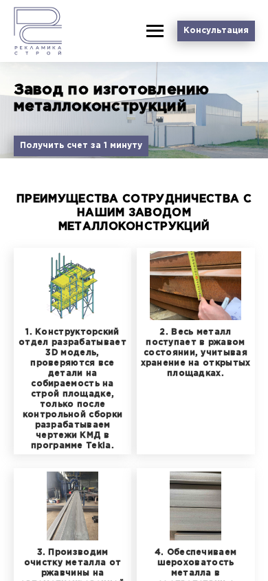 Портал РС МЕТАЛЛ является веб-сайтом металлостроительной компании, расположенной по адресу улица Суражская 10, корпус 17, в Минске, Беларусь. Компания специализируется на производстве металлических конструкций различной сложности, обслуживая как стандартные, так и индивидуальные проекты. На сайте представлена информация о возможностях производства, услугах и контактных данных компании. Посетители могут запросить расценку для своих проектов и получить ее в течение минуты. Компания гордится своим передовым производственным процессом, который включает очистку металла и подготовку поверхности для лучшего прилипания защитных покрытий. На сайте также представлена секция о преимуществах сотрудничества с их металлостроительным заводом.