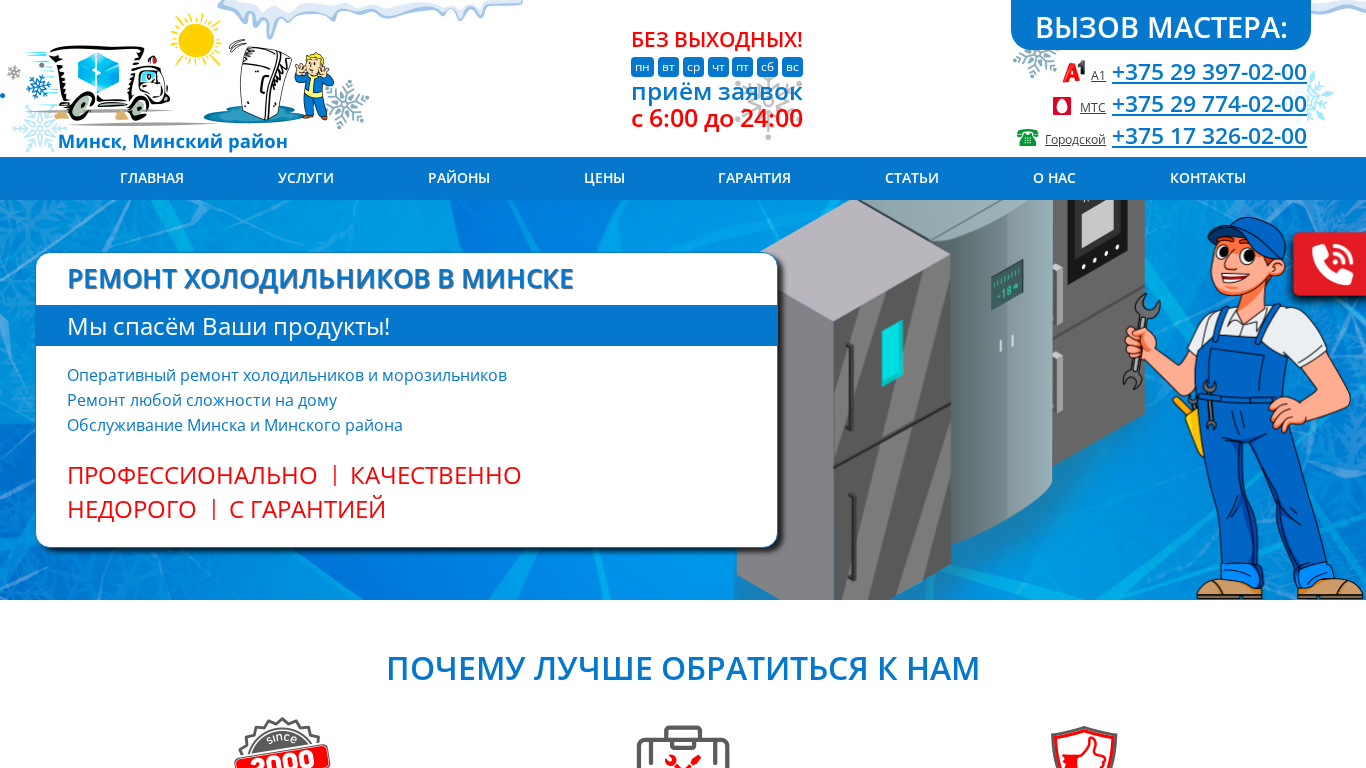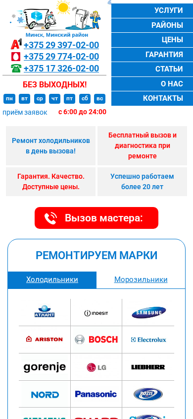 | SEO-описание | Ремонт холодильников в Минске ❄️ Большой опыт • Гарантия • Низкие цены • Скидки ❄️ Звоните ☎️ +375 29 397 02 00 Velcom, +375 29 774 02 00 МТС |