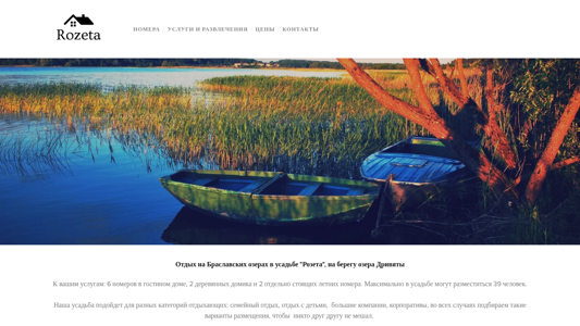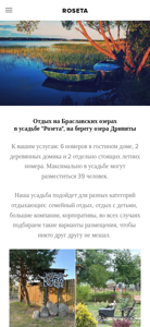 | AI-анализ | The web project "Roseta" is a vacation resort located on the shores of Lake Drivery in Belarus. It offers 6 rooms in the main building, 2 wooden cottages, and 2 separate summer houses. The resort can accommodate up to 39 guests. It caters to various types of vacationers, including families, groups with children, large companies, and corporates. The name of the resort corresponds to the name of the nearby quiet village. The village is surrounded by an lake and a pine forest, providing a unique and peaceful location. The resort offers healthy accommodation in log cabins, home-cooked meals using locally grown produce, and a small museum of antique items for ethnography enthusiasts. There are open animal enclosures with domestic animals and a nesting site for herons. The resort provides barbecue facilities, bonfires, a sauna with a small |