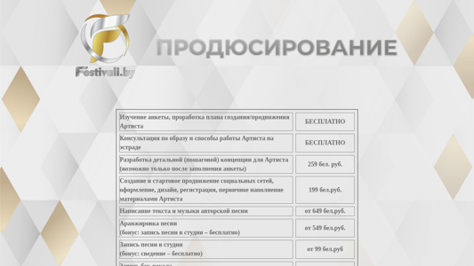 | AI-анализ | Сайт Producing.festivali.by предлагает услуги по производству для артистов. По запросу сайт помогает проанализировать профиль исполнителя, разработать план его творчества и продвижения. В рамках предоставляемых услуг включены бесплатные консультации по образу жизни и работе на сцене. Кроме того, за плату сайт предлагает детальное развитие концепции, создание и заполнение социальных сетей, написание текстов и музыки для оригинальных песен, аранжировку, запись и продвижение в различных медиа. Цены варьируются от 259 до 799 белорусских рублей. Сайт также предлагает дополнительные услуги, такие как бесплатная студийная запись для подготовленных треков и бесплатный дизайн для наружной рекламы. Другие услуги включают управление SMM, таргетирование, производство видеоклипов и консультации по тренду. Домен сайта — producing.festivali.by. |