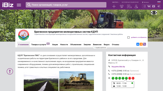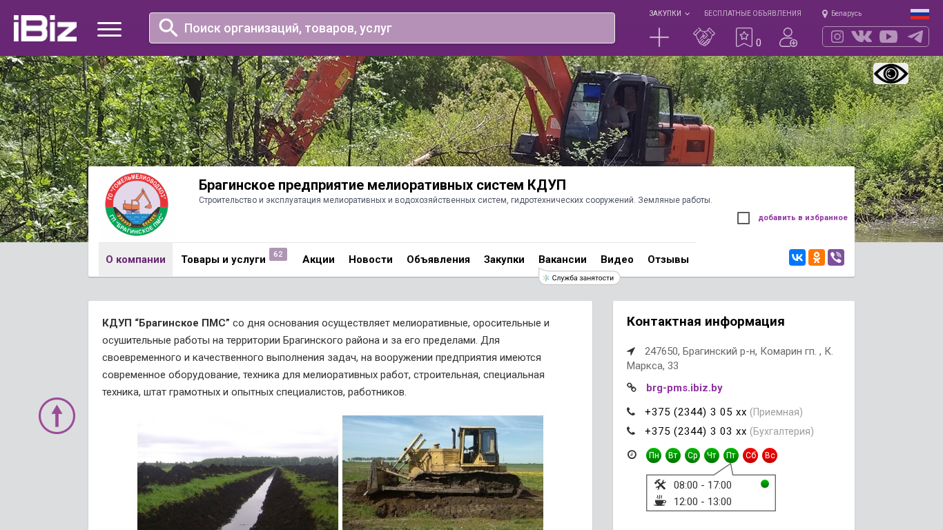 | Название / Заголовок | Брагинское предприятие мелиоративных систем КДУП - Строительство и эксплуатация мелиоративных и водохозяйственных систем, гидротехнических сооружений. Земляные работы.. 247650, , Комарин гп. , К. Маркса, 33 |