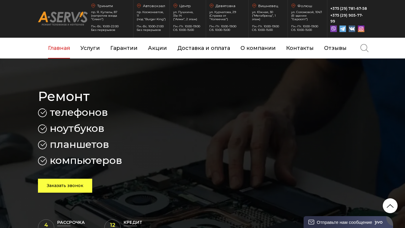 | AI-анализ | Портал A-Service предлагает услуги по ремонту телефонов, ноутбуков, компьютеров и планшетов в Гродно по доступным ценам. Бесплатная диагностика. Качественные компоненты. Чистка, настройка и замена деталей. Мы предоставляем гарантию на все ремонты и запчасти, от 1 до 24 месяцев. Свяжитесь с нами по телефонам +375 (29) 781-67-58 или +375 (29) 905-77-99 за помощью. Наши адреса: пр. Тринити, д. 87 (противостояние Зеленому), пр. Автовокзал, д. 11 (под Бургер Кингом), ул. Центр, д. 31а-14 ("Алми", 2 этаж), Двиэтавка ул. Курчатова, 29 (рядом с "Копейка"). |