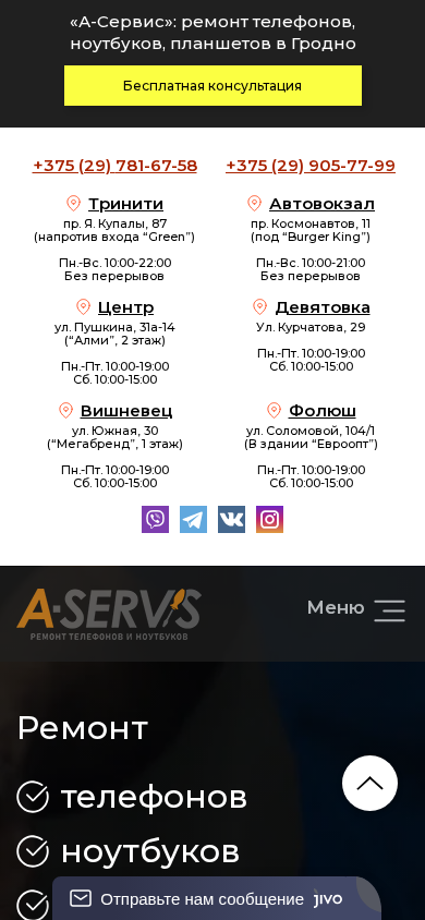 | SEO-описание | «А-Сервис» ⭐: предлагает услуги по ремонту телефонов, ноутбуков, компьютеров в Гродно по доступным ценам. Бесплатная диагностика ✅. Качественные комплектующие ✅. Чистка, настройка, замена ✅. Даем гарантию на любой ремонт и запчасти – от 1 до 24 месяцев ✅. Делаем на совесть! Звоните ☎ +375 (29) 781-67-58, +375 (29) 905-77-99 |