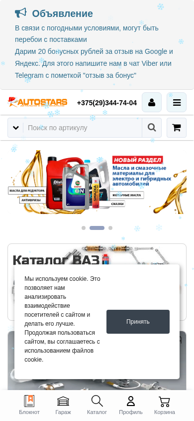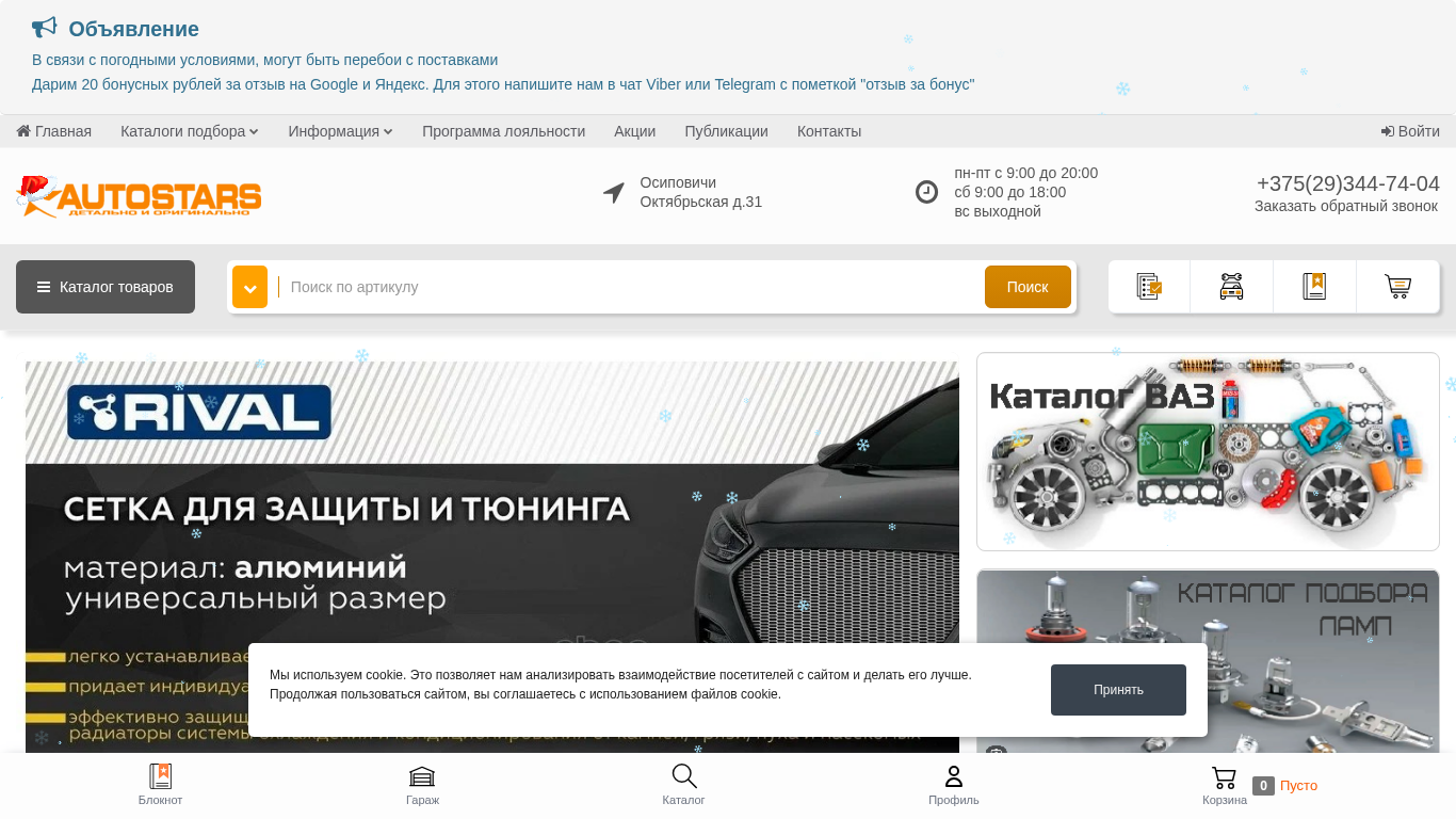Сайт AUTOSTARS.BY представляет собой электронный магазин, специализирующийся на продаже автомобильных запчастей в городе Осиповичи, Беларусь. Название и описание указывают на то, что основной акцент делается именно на автомобильных запчастях. Ключевые слова подтверждают это, включая слова "запчасти", "каталог" и "покупка". Верхние слова предполагают, что среди предложенных товаров присутствуют инструменты, комплекты и крепежные элементы. Сайт предлагает несколько каталогов для различных типов автомобильных запчастей, включая лампы, наличие, ARNEZI, POLCAR, и POLMOSTROW. Также на сайте представлена информация о порядке заказа, доставке и программе лояльности, а также контакты для обращений или оформления заказов. Основные категории товаров включают автомобильные химические средства и косметику, автомобили, инструменты, оборудование гаража, электронику, аксессуары и автомобильные комплектующие. Сайт предоставляет функцию поиска по статьям и названиям. Контактная информация включает телефонный номер.