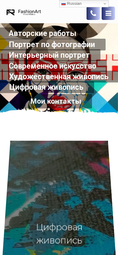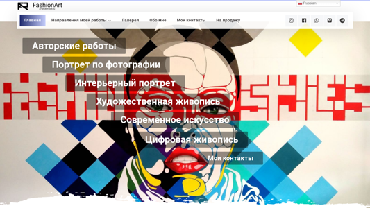 Этот онлайн-ресурс принадлежит художнику Анатолию Рабкову и демонстрирует его портфолио работ, в основном сосредоточенное на портретах и современном искусстве. Сайт включает в себя смесь традиционных и цифровых техник живописи, с некоторыми произведениями, отражающими импрессионистский, постмодернистский или кубистический стиль. Посетители могут найти различные портреты людей с многоцветными лицами, а также работы, созданные методом "сплэш", где используются разбрызгивания краски. На сайте также представлена информация о художнике и его контакты для потенциальных покупателей. Сайту присвоены ключевые слова: живопись, импрессионизм, постмодернизм, современность, сплэши, портрет, поп-арт, многоцветные лица, холст, картины.