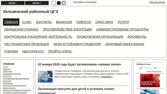 | AI-анализ | This website is the official homepage of the Zhylavsky District Center for Hygiene and Epidemiology in Belarus. The title of the website is "Зельвенский районный центр гигиены и эпидемиологии" and it includes sections such as "About Us," "Contacts," "Vacancies," "News," and "One Window" for various services and inquiries. Keywords associated with the website include "open," "section," "subpoint," "healthy," "more information," "citizens," "articles," "organization," "work," "goals," "people," "information," "Zhelvan district," "district," "prevention," "801564," "sustainable development," "healthy lifestyle," "interview for applicants," "exam for applicants," |