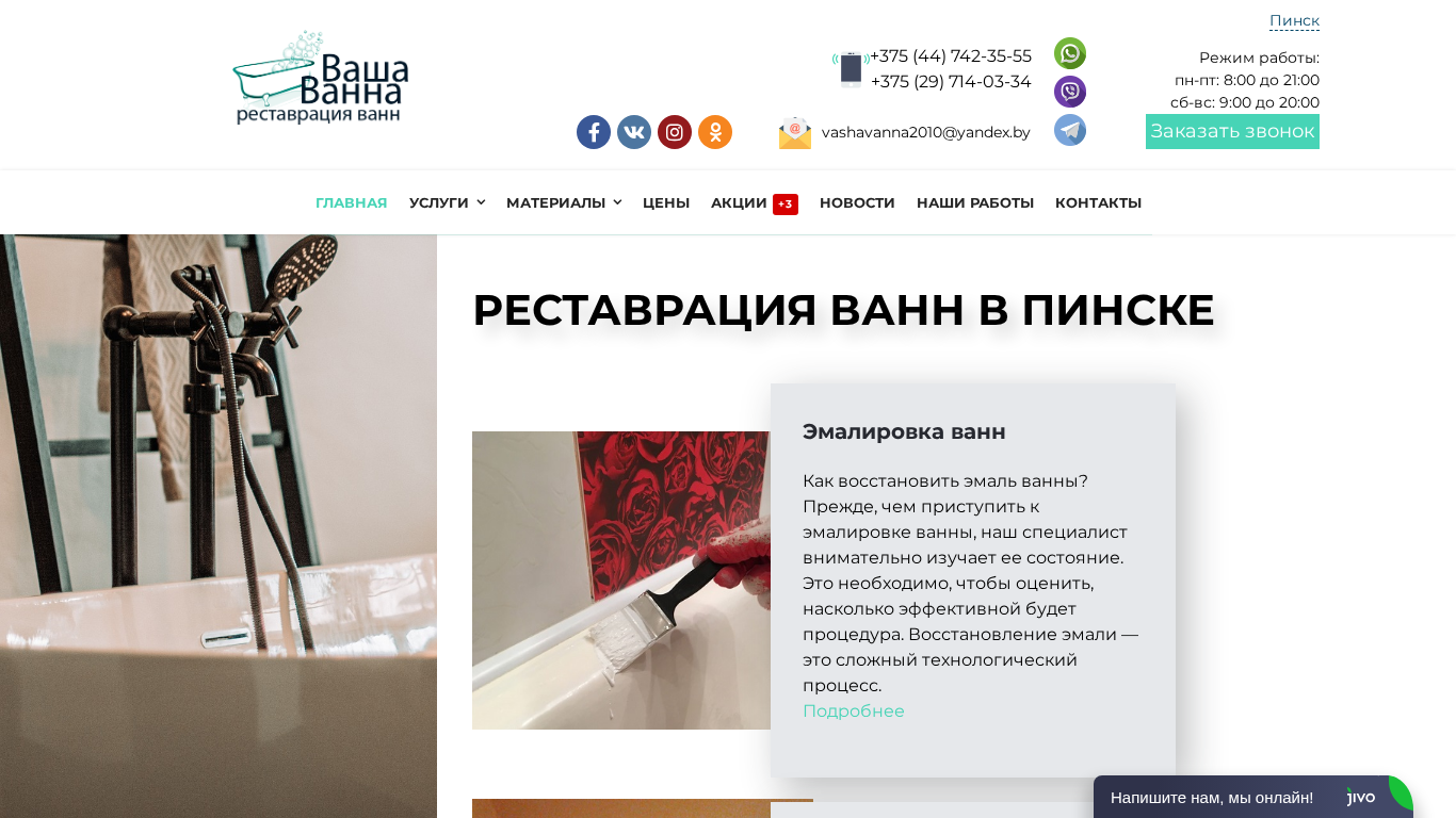 | SEO-описание | Реставрация ванн по низким ценам в Пинске. За наличный и безналичный расчет. В розницу и оптом. Эмалировка, наливная ванна, акриловая вставка. Звоните и уточните информацию по телефону +375 (29) 714-03-34 |