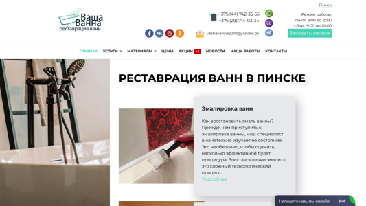 | AI-анализ | This website offers bath restoration services in Pinsk, Belarus, including enameling, cast iron tubs, and acrylic inserts. The website provides contact information for both cash and non-cash transactions and operates Monday through Saturday from 8:00 am to 9:00 pm and Sunday from 9:00 am to 8:00 pm. Services offered include emalizing tubs, cast iron tub restoration using liquid acrylic or acrylic lining, and acrylic inlay installation. The website also includes information about materials used, such as emali for enameling and acrylic for cast iron tubs and inlays, as well as pricing, promotions, and news about the company's work. |