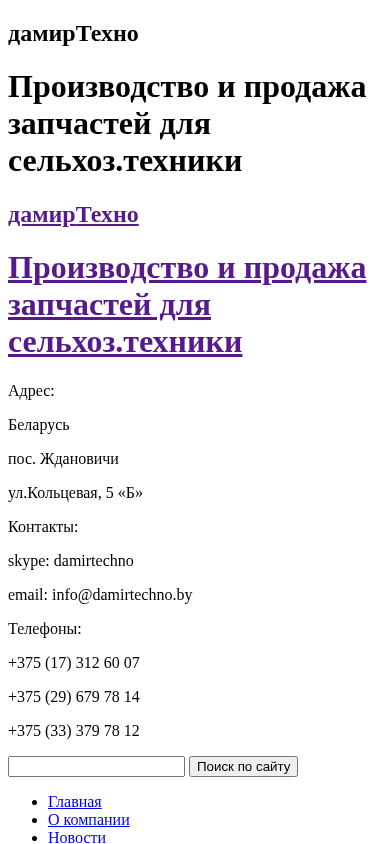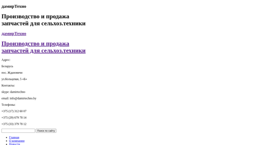 | AI-анализ | The portal Damir Techno is a manufacturing and sales platform for agricultural machinery parts in Belarus. The website's contact information includes a Skype ID (damirtechno), email address (info@damirtechno.by), and several phone numbers: +375 (17) 312 60 07, +375 (29) 679 78 14, and +375 (33) 379 78 12. The company's location is in the village of Zhdanovichi, Belarus, at ul. Koltsевая, 5 «Б». The website features sections for producers, news, contacts, and a contact form for users to leave their information for a callback. The main product categories include nozzle spreaders (PMF-18, PSS- |