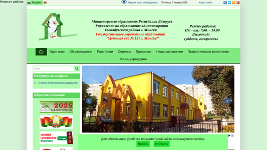| AI-анализ | --- This online resource, titled "Я/с №131 г.Минска" (translated as "JSC №131 g.Minsk"), provides news and information about the educational institution of the same name. Keywords related to the website include 'читать' (read), 'далее' (further), '2025' and '2026', 'образования' (education), and 'минска' (Minsk). The website offers news about the institution, the city of Minsk, and the region, as well as popular sections such as 'Обратите внимание' (Pay Attention) and 'Схема безопасного маршрута' (Safe Route Map). The homepage displays recent news articles, including 'Волшебство снега: как наши воспитан |