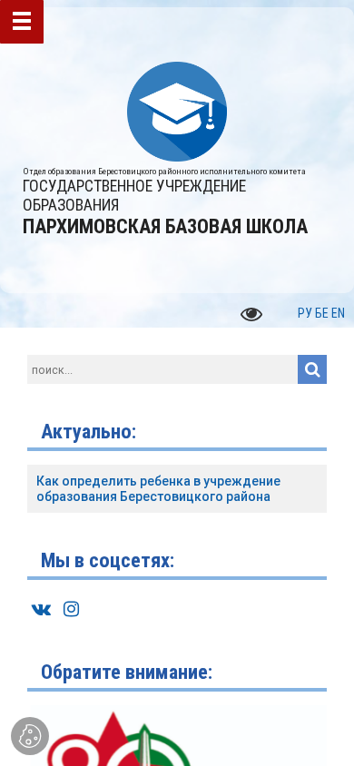 | Адрес | Пархимовская базовая школа", Адрес:, 231771, Гродненская область, Берестовицкий район, агрогородок Пархимовцы, улица Парковая, 3 |
