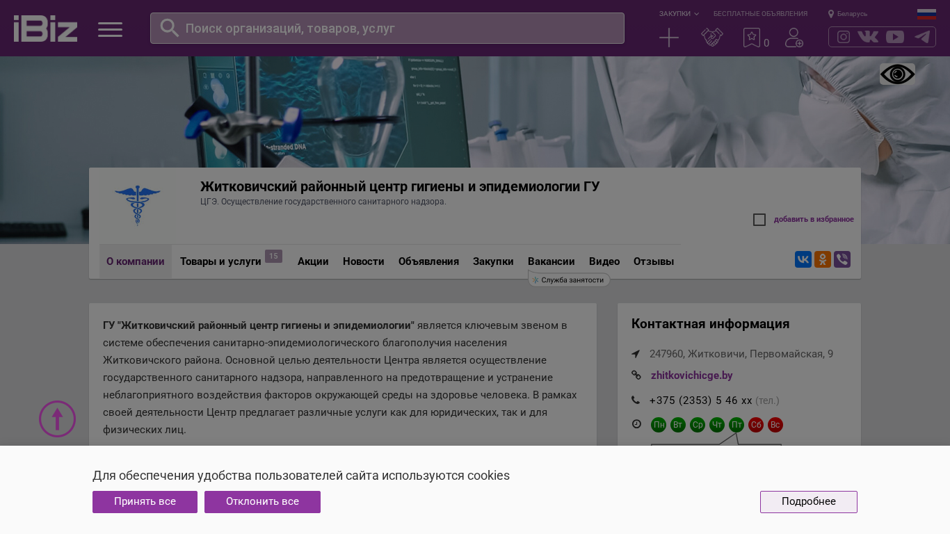 | AI-анализ | This website is the "Житковичский районный центр гигиены и эпидеmiologии ГУ - ЦГЭ" (Jitkovichi Regional Center for Hygiene and Epidemiology of the GU) responsible for implementing state sanitary oversight in the Žitkavichy region, Belarus. The site contains information about the company, its services for both legal entities and individuals, and contact details. Services for legal entities include certifying workplaces, investigating production waste, assessing risks to population health, assessing professional risks, and laboratory tests. Services for individuals include laboratory diagnosis, tick inspections, sanitary-hygienic laboratory tests, and consultations. The website aims to ensure a high level of sanitary-epidemiological wellbeing for the population of Žitkavichy region by providing quality and demanded services that protect |