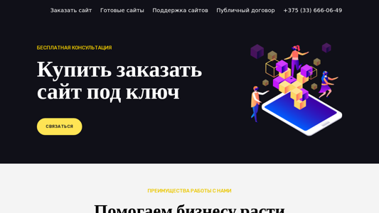 | AI-анализ | This online resource is a website offering website development and optimization services. The title of the website is "Купить заказать сайт под ключ - Купить, заказать сайт под ключ", and the description includes keywords such as "сайт", "заказать", "рублей", "под", "купить", "ключ", "готовые сайты", "поддержка сайтов", "публичный договор", and "375". The website provides services including website purchase, website ordering, website development, and website support, with a public contract and contact number +375 (33) 666-06-49. The website claims to help businesses grow by creating websites of any complexity, attracting visitors, and converting them into clients. It also offers website optimization, |