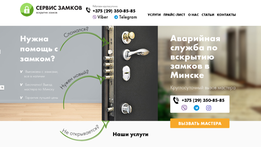 | SEO-описание | Срочное вскрытие дверных и автомобильных замков в Минске. Установка, замена и ремонт дверных замков. Выезд мастера в течении 20 минут. 👍 Гарантия на все виды работ и замки. ☎ +375 (29) 350-85-85 |
