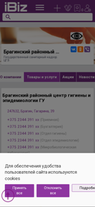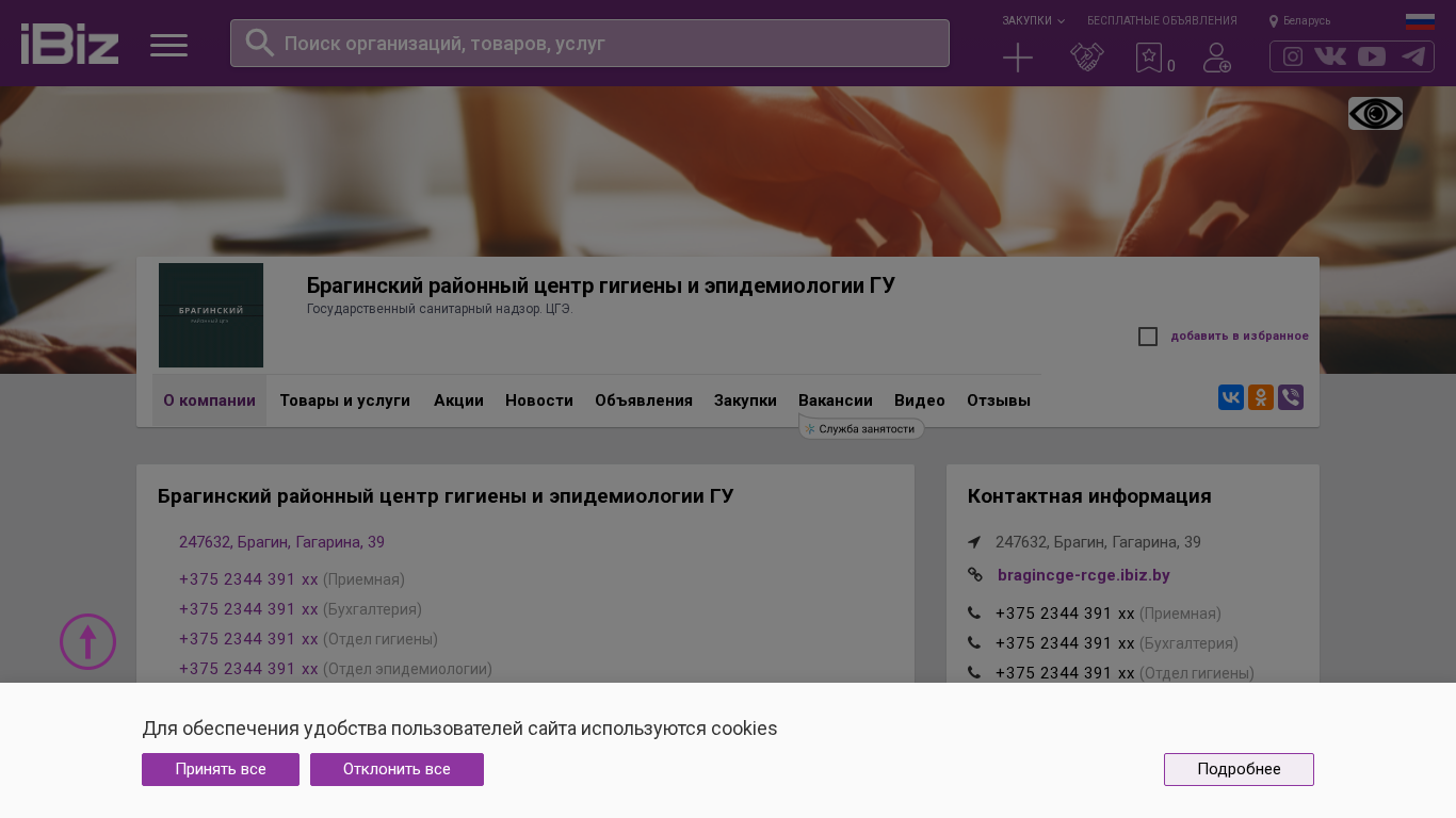 | AI-анализ | Портал является государственным центром здравоохранения и эпидемиологии, носит название "Центр гигиены и эпидемиологии Брагинского района подведомственности Государственного санитарного надзора". Он расположен в городе Брагин, Беларусь, по адресу: улица Гагарина, 39. Веб-сайт содержит контактные номера для приема, бухгалтерии, отдела гигиены, эпидемиологического отдела и микробиологической лаборатории, а также номер УНП для идентификационных целей. Портал предоставляет информацию о компании, товарах и услугах, новостях, объявлениях, вакансиях, видео и отзывах. Время работы приема на десктопе составляет с 9:00 до 17:00, с перерывом на обед с 13:00 до 14:00, по будням. Компания классифицируется под "Санитарно-эпидемиологические станции". |