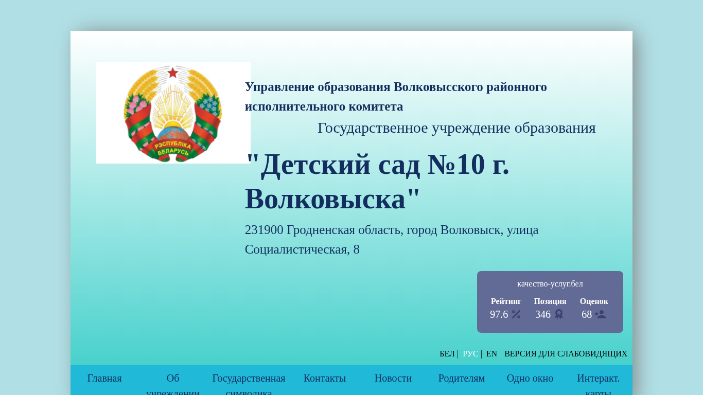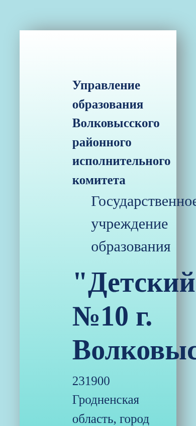 | Адрес | учреждение образования "Детский сад №10 г. Волковыска", 231912, Гродненская область, город Волковыск, улица Социалистическая д.8 |