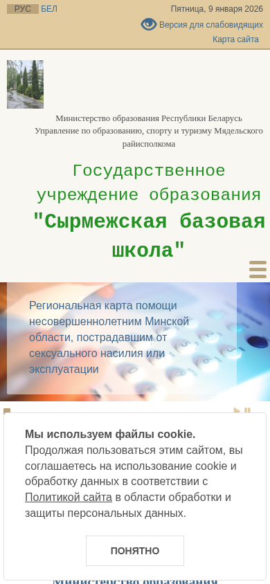 Сайт предназначен для "Сырмежской базовой школы" в Мядельском районе, Минской области, Беларусь. Это государственное образовательное учреждение с администрацией, педагогическим коллективом, социально-психологической службой и библиотекой, медиатекой. Сайт предоставляет информацию о структуре, задачах, функциях и услугах учебного заведения. В его состав входят разделы для административных процедур, электронной подачи заявлений, популярных запросов, контактов и графика работы. Также на сайте представлены разделы для школьной деятельности, включая шестой учебный день, информационно-экспозиционную работу и оздоровление (оздорование переводится как "реабилитация" или "отдых" на английском). Сайт также содержит разделы для родителей, такие как консультации с психологом и дефектологом (специальное образование).