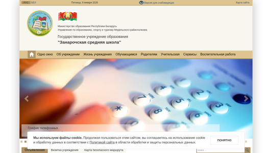| AI-анализ | Сайт предназначен для "Занарочской средней школы" (Zanaroch Secondary School), образовательного учреждения, расположенного в Мядель, Беларусь. На сайте представлена информация о рабочих часах администрации и процедурах подачи заявлений, а также ссылки на различные нормативные документы и контактную информацию Министерства образования и регионального отдела образования. Сайт также включает расписание занятий, информацию о платных услугах и ресурсы для учащихся, такие как библиотека и психологическая служба. Кроме того, на сайте есть разделы с новостями и информационными материалами, а также раздел для родителей с информацией о встречах учителей и экзаменах учащихся. Сайт управляется Мядельским районным отделом образования и является частью белорусской системы образования. |
