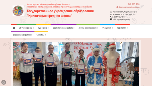 | AI-анализ | Сайт предназначен для Кривичской Средней Школы (Кривичская СШ), образовательного учреждения в Республике Беларусь под юрисдикцией Министерства образования Республики Беларусь, Мядельского районного исполнительного комитета и Государственного образовательного учреждения "Кривичская Средняя Школа" (Кривичская СШ). На сайте представлена информация о структуре школы, новостях и событиях, истории, целях и достижениях. Он содержит детали по образовательному стилю, предметам обучения и дополнительным учебным занятиям. Также имеются разделы по вопросам здравоохранения и безопасности, правовой защиты и социально-экономической поддержки. Сайт включает в себя календарь личных встреч с администрацией школы, а также контактную информацию для обращений. |