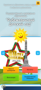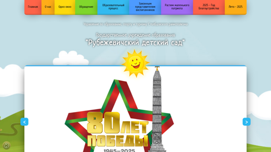 Сайт "Рубежевичский детский сад" (Rubezhevichi Kindergarten) — это белорусское государственное образовательное учреждение, предоставляющее дошкольное образование. На сайте представлена информация о управлении kindergarten, условиях приема, персонале, истории, новостях, интерактивной карте, галерее фотографий и контактных данных. Кроме того, включены разделы по политике обработки личных данных и управления cookie, административным процедурам и структуре учреждения. Сайт также содержит информацию о процессе обучения, критериях приема, мерах безопасности, а также о различных тематических днях и онлайн-экскурсиях. Домен является частью образовательной сети "stolbtsy-edu.gov.by".