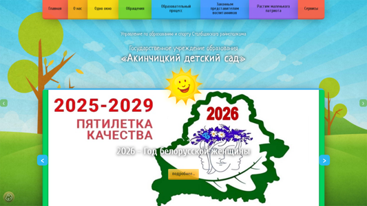 | AI-анализ | Сайт является государственным детским садом под названием "Акинчицкий детский сад" (Akinchicki Detski Sad), расположенным в Столбцах, Беларусь. Сайт предлагает обширную информацию о детском саду, включая его миссию, структуру, административные процедуры и правила для педагогических работников. Он также содержит актуальные новости, галерею фотографий и информацию по вопросам приема детей. Сайт разделен на разделы, такие как "О нас", "Задачи и функции образовательного учреждения" и "Новости учреждения". На сайте представлена также информация о процессах обучения, нормативно-правовой базе и различные услуги поддержки для детей и родителей. Домен является частью "stolbtsy-edu". |