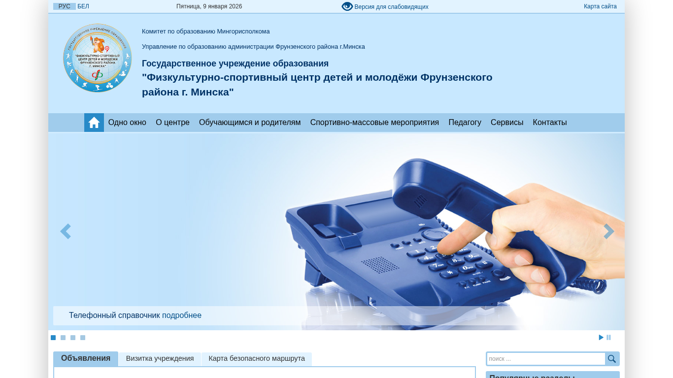 | AI-анализ | Этот сайт предназначен для "Физкультурно-спортивного центра детей и молодёжи Фрунзенского района г. Минска" (Центра физической культуры и спорта для детей и молодёжи Фрузненского района, Мinsk). Он является образовательным учреждением под юрисдикцией Комитета по образованию Минского городского исполнительного комитета и Администрации Фрунзенского района. Сайт предоставляет информацию о центре, его расписании, контактах, а также о различных мероприятиях и акциях. Ключевые слова включают "центр", "дети", "молодёжь", "спорт", "новости", и "расписание". На сайте представлены карта, подписка на RSS, различные документы и услуги. Центр предлагает платные услуги и имеет основное профсоюзное объединение. Также имеются разделы с информацией о безопасности, вакансиях, ресурсах для учащихся и родителей. Сайт администрируется Фрузненским районным отделением. |