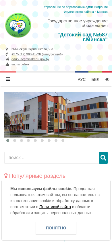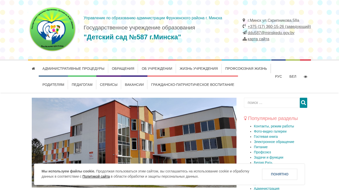 | Адрес | деятельности), +375 (17) 360 15 57, (вахта), Адрес электронной почты: ddu587@minskedu.gov.by, Карта проезда:, до остановки общественного транспорта "Воложинская", автобусы 12 |
