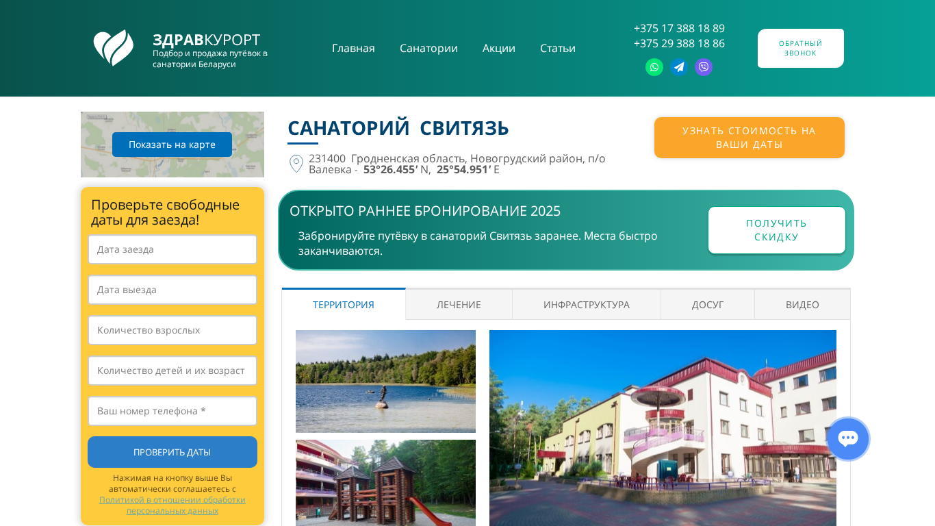 | SEO-описание | Забронируйте путёвку в санаторий Свитязь. Санаторий на берегу жемчужины Белоруссии озере Свитязь. В здравнице создана прекрасная база для лечения болезней органов дыхания, сердечно-сосудистой системы и опорно-двигательного аппарата. Всего применяют 70 видов оздоровительных процедур. Узнайте доступность номеров в санатории Свитязь на ваши даты. |