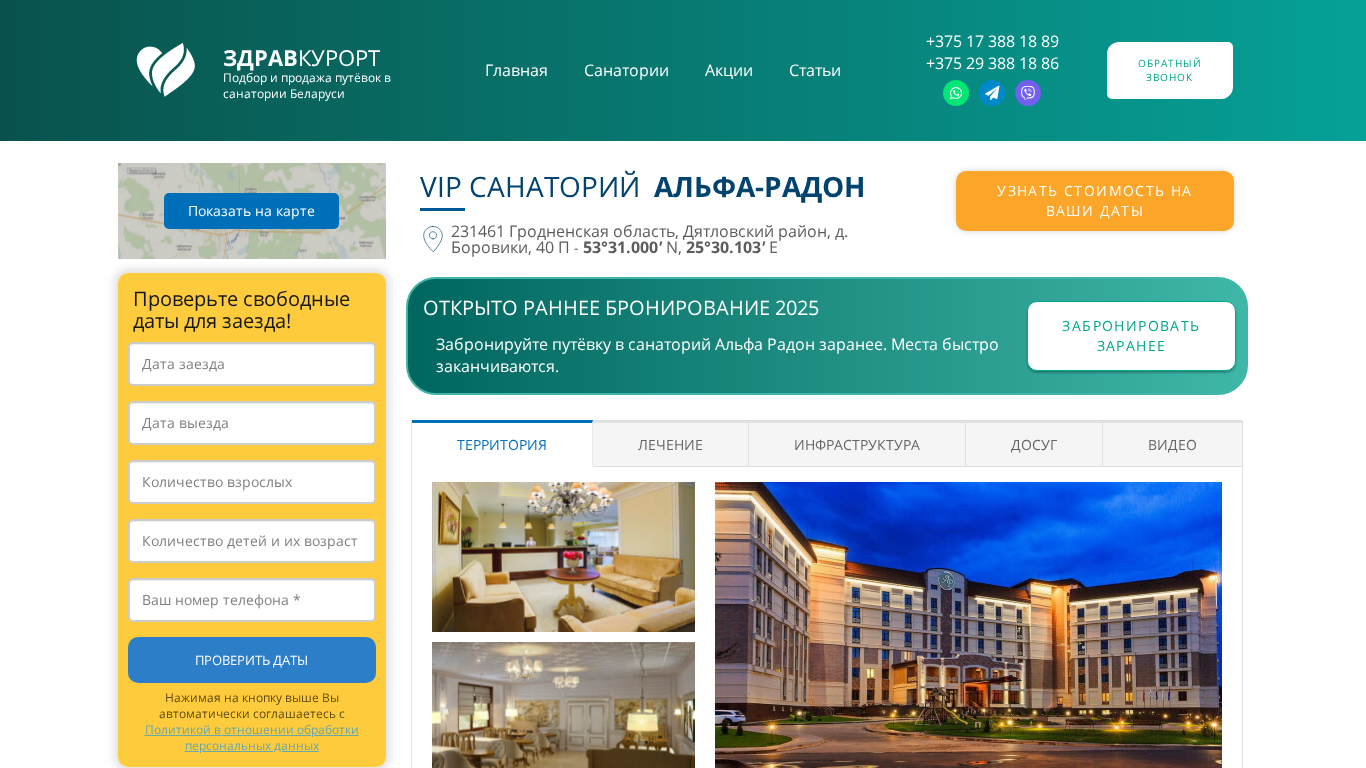 | SEO-описание | Забронируйте путёвку в санаторий Альфа-радон - самый крутой санаторий Беларуси, который удостоен премии «Санаторий №1» в Беларуси. Узнайте доступность номеров в санатории Альфа-радон на ваши даты. |
