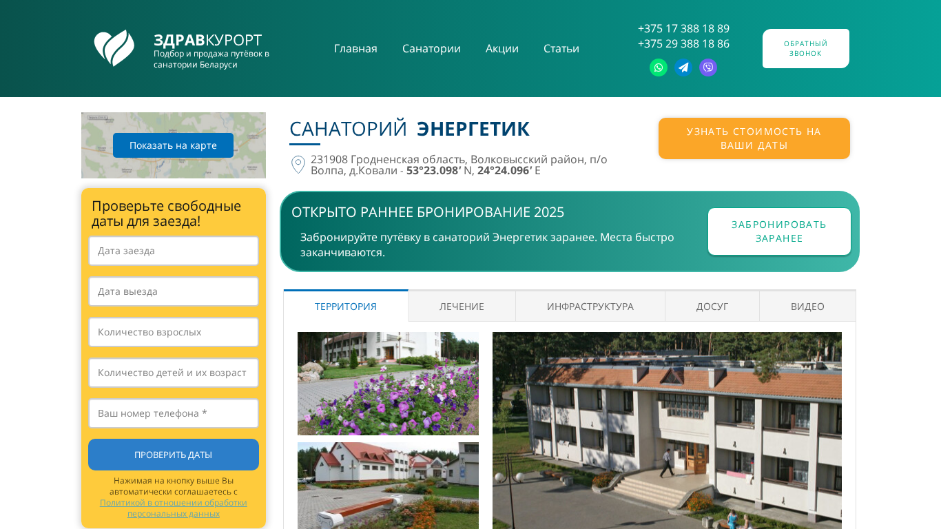 | SEO-описание | Забронируйте путёвку в санаторий Энергетик - санаторий с широким перечнем медицинских профилей. Один из ведущих санаториев Республики Беларусь, расположен в сосновом бору вблизи крупного Волпянского водохранилища, в экологически чистом районе Гродненской области. Узнайте доступность номеров в санатории Энергетик на ваши даты |