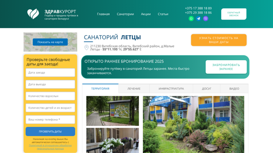 Этот сайт предназначен для санатория Летцы, расположенного в окрестностях соснового леса у озера. Сайт предоставляет информацию о бронировании номеров в санатории Летцы и его доступности на конкретные даты. Ключевые слова включают 'санаторий Летцы', 'сайт Летцы', 'официальный сайт Летцы', 'белорусский санаторий', 'санаторий в Беларуси', 'здоровье курорт', 'санаторий у озера'. Сайт предлагает продажу и выбор билетов на санатории в Беларуси, включая телефоны для бронирования и карту местоположения. Основные особенности санатория включают полный развлекательный программы, плавательный бассейн, косметологию, пляж и кабинет стоматолога. Санаторий также предлагает процедуры в спа-центре, использующие натуральный сапропелевый ил, который расширяет капилляры.