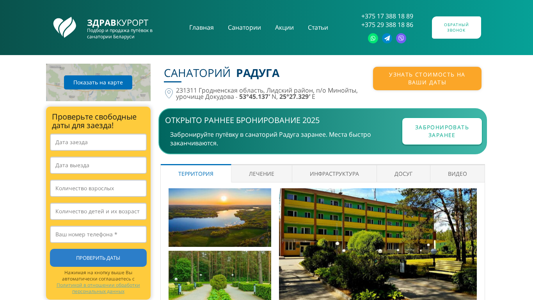 Этот сайт предназначен для санатория "Радуга", маленького курорта здоровья, расположенного вдали от промышленных объектов и населенных мест. Территория чистая экологически и предлагает захватывающие пейзажи. Воздух исключительно чистый, с сосновыми лесами, аллеями береста, дубовыми рощами и лесами, наполненными фруктами и грибами. Проверьте наличие номеров в санатории "Радуга" для ваших дат. Ключевые слова: санаторий "Радуга", официальный сайт "Радуги", белорусский санаторий, санаторий в Беларуси, курорт здоровья, размещение среди лесов, на берегу реки. Топ-слова: числа, санаторий, санатории, Радуга, место, номера, даты, связь, обработка, личные данные, 2-х, санатория, введите, нажмите кнопку выше, автоматически согласитесь на политику. Unp: 19323791