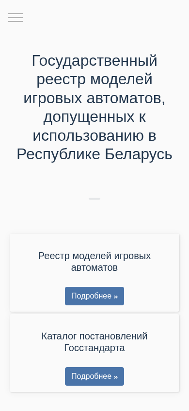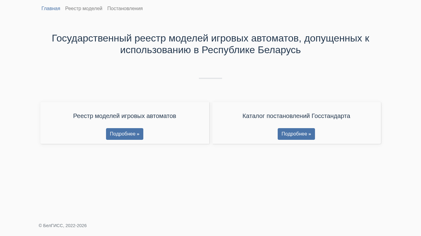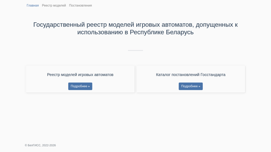 Этот сайт посвящен Государственному реестру одобренных моделей игровых автоматов в Беларуси. Он предоставляет информацию по списку одобренных моделей игровых автоматов, а также детали о связанных с этим регуляциях и указаниях. Сайт поддерживается Государственным комитетом стандартизации Беларуси, что указывается в доменной части "gosstandart". Сам реестр упоминается как "Государственный реестр моделей игровых автоматов" в тексте. На сайте также присутствует ссылка на библиотеку Font Awesome, что отражается в ссылках на "fontawesome.com". Домен зарегистрирован под доменом .BY верхнего уровня для Беларуси.