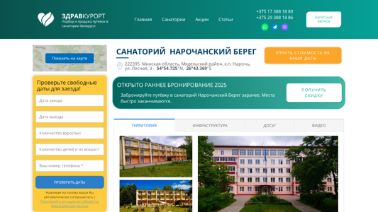 Портал "Нарочанский Берег" представляет собой санаторий, расположенный на живописном берегу озера Нарочь в одноименном национальном парке, в северо-западной Беларуси. Санаторий предлагает высококачественные услуги, ответственный подход к решению даже самых мелких вопросов и полную гарантию удовлетворенности клиента. Посетители могут проверить наличие свободных номеров в санатории "Нарочанский Берег" на их желаемые даты. Сайт предоставляет информацию о санаториях Беларуси, предлагает продажу билетов и включает телефонные номера для справок и бронирования обратного звонка. Основными преимуществами санатория являются экологически чистые условия, использование Нарочанской минеральной воды и доступ к плавательному бассейну в соседнем санатории. Система автоматически расписывает процедуры, исключая ожидание при записи на прием. На сайте также представлены зоны для барбекю.