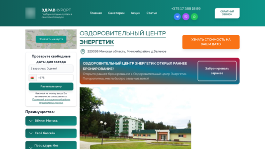 | SEO-описание | Оздоровительный центр Энергетик находится в 14 км от Минска. Свой крытый бассейн, сауна. В 4 км от здравницы Минское море. Проверьте доступность номеров на нашем сайте. |
