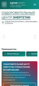 | AI-анализ | Проект веб-сайта "Оздоровительный центр Энергетик | Туроператор Здравкурорт" предлагает услуги здоровья и благополучия вблизи Минска, Беларусь. Центр расположен в 14 км от Минска и включает в себя крытый бассейн и сауну. Ближайшее море (Минское море) находится всего в 4 км. Посетители могут проверить наличие свободных номеров на сайте. Проект также включает разделы для бронирования путешествий и продажи пакетов по другим санаториям Беларуси. Сайт предоставляет информацию о ценах, акциях и статьях. Контактный телефон +375 17 388 18 89 для справок и бронирований. В центре есть крытый бассейн длиной 25 метров с финской сауной и хаммамом. Лечебные процедуры доступны семь дней в неделю с 8:00. |