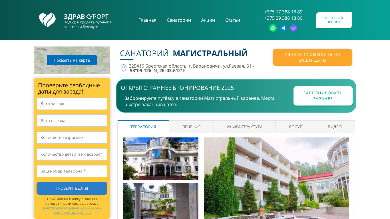 | AI-анализ | Этот онлайн-ресурс представляет собой веб-сайт для Магистрального санатория, предлагающий пять различных профилей лечения. Посетители могут забронировать номер в Магистральном санатории, известном как один из лучших курортов Беларуси, на свои предпочтительные даты. Сайт включает главную страницу для санаториев, раздел с действиями, статьи и контактная информацию с телефонными номерами для бронирования и справок. Сайт автоматически собирает и обрабатывает личные данные при нажатии на определенные кнопки, согласно политике обработки данных пользователя. Основные характеристики санатория включают сильную терапевтическую базу, клинику стоматологии, теплые коридоры, соединяющие здания, подводный спинальный тракцион и два бассейна. Санаторий расположен в живописном смешанном лесу, предлагая чистый и свежий воздух, и предлагает мокрые ванны с использованием сапропелевыми и сульфидными водами. |