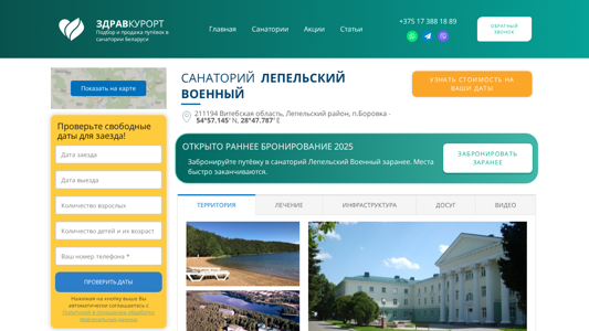 | AI-анализ | Сайт предназначен для многофункционального санатория "Лепельский Военный", расположенного в сосновом лесу между двумя глубоководными озерами, Бобрица и Щибот. Он предлагает бронирование номеров и предоставляет информацию о доступности на определенные даты. Сайт также включает в себя телефон для услуги обратного звонка, карту местоположения и детали о преимуществах санатория, такими как его спокойная окружающая среда, разнообразные развлекательные программы и медицинские услуги. Сайт является частью платформы "ЗДРАВ КУРОРТ" для бронирования и продажи билетов в санатории Беларуси. На сайте наиболее часто упоминаемые слова включают "номера", "даты", "узнать", "номер", "цену", "дата". |