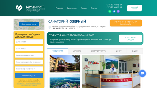 Проект веб-сайта "Озерный 💙 - санаторий высшей категории с аквапарком и бассейном" является официальным ресурсом для высококатегорного белорусского санатория, расположенного вблизи города Озери, Гродненской области. Сайт предлагает информацию о наличии номеров, бронировании и контактных данных. Ключевые слова включают 'санаторий Озерный', 'Озерный сайт' и 'официальный сайт Озерный'. Сайт сосредоточен на курорте санатория у озера Белое, где есть большой бассейн и частный аквапарк. Бассейн имеет длину 25 метров и использует современные технологии для очистки воды. Аквапарк занимает площадь в 1000 квадратных метров и включает три водные горки. Санаторий предлагает как сухую, так и подводную трение для лечения позвоночника, процедуру, не всегда доступную во всех санаториях.