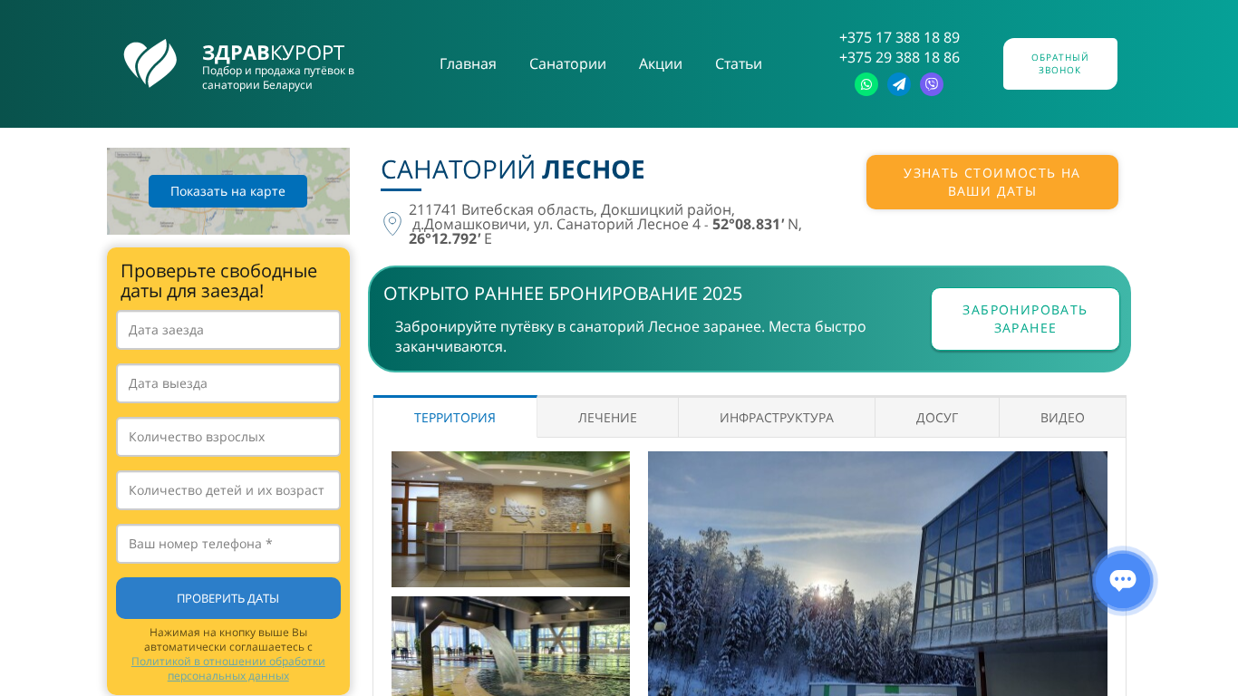 | SEO-описание | Забронируйте путёвку в санаторий Лесное - здравница находится среди лесного массива, оптимально удалённого от городских просторов - на границе Березинского биосферного заповедника. Близость озера и леса делают выздоровление быстрее и приятнее |