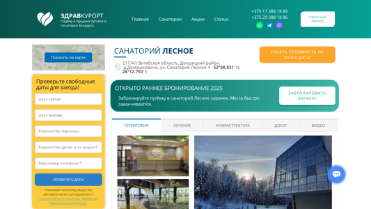 | AI-анализ | Этот онлайн-ресурс является официальным сайтом санатория "Лесное", расположенного в наиболее экологически чистой и живописной зоне Беларуси, на границе Берецинского биосферного заповедника. Применение к озеру и лесу ускоряет и делает процесс восстановления более приятным. Сайт предлагает бронирование и покупку билетов в санаторий "Лесное", а также информацию о его удобствах, местоположении и контактных данных. Основные преимущества санатория включают доступ к озеру с песчаной набережной, луговой пляже с плавательным комплексом на лето, аренду катамаранов, лодок и каноэ, а также наличие спа-комплекса с 25-метровым бассейном, русскими и финскими саунами, инфракрасной сауной, двумя горячими джакuzzi и криотерапевтической камерой экстремального уровня. На сайте также предлагается аренда жилья. |