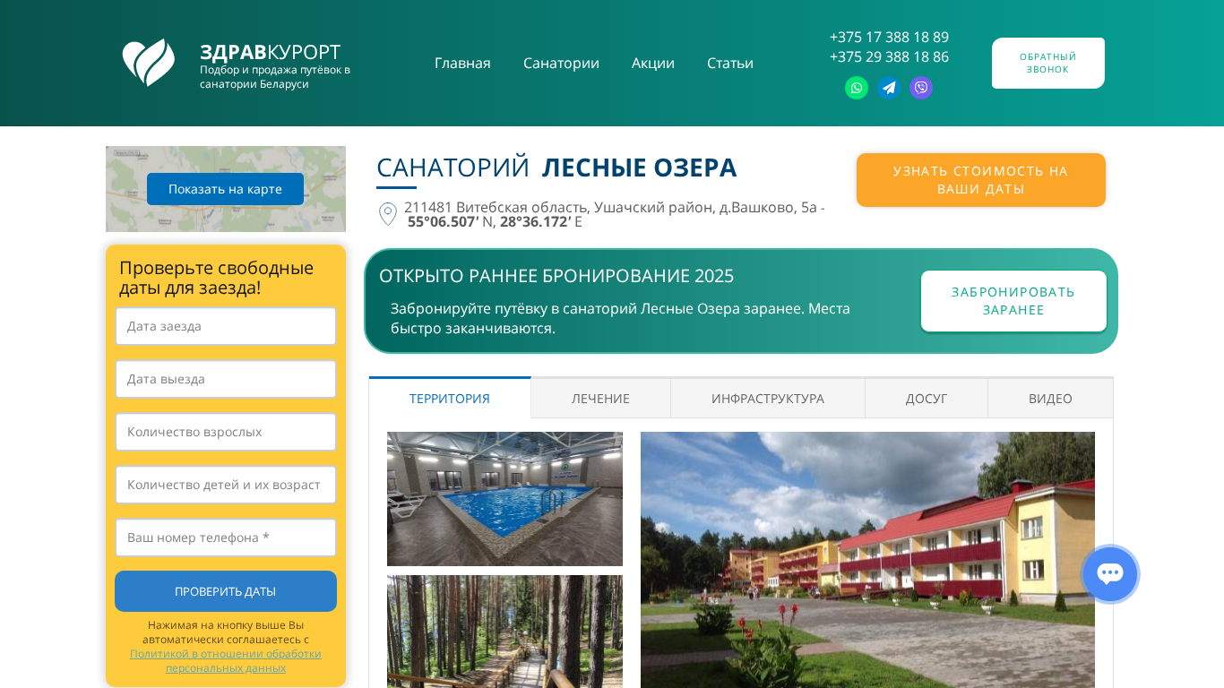 | SEO-описание | Забронируйте путёвку в санаторий Лесные Озера - экологически чистая природная зона, живописный сосновый бор, упоительно свежий воздух и близость водоемов. Отдых и оздоровление на минеральных источниках с вековой историей. Узнайте доступность номеров в санатории Лесные Озера на ваши даты |