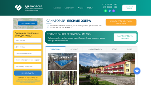 | AI-анализ | Сайт предназначен для санатория под названием "Лесные Озера" в Беларуси. Посетители могут забронировать номер в санатории и найти информацию о его доступности на определенные даты. Сайт предлагает карту местоположения, телефоны для бронирования и возможность обратного звонка. Также включает информацию о преимуществах санатория, таких как собственные минеральные источники воды, бесплатный доступ к услугам для людей с ограниченными возможностями и окружающий лес с двумя минеральными озерами. Санаторий специализируется на лечении мочеполовой системы и использует натуральный сапропелевый ил для процедур. Сайт является частью сети "Здрав Курорт" и имеет разделы, посвященные основным преимуществам, действиям и контактам. Ключевые слова включают различные термины, связанные с санаторием и его услугами. |