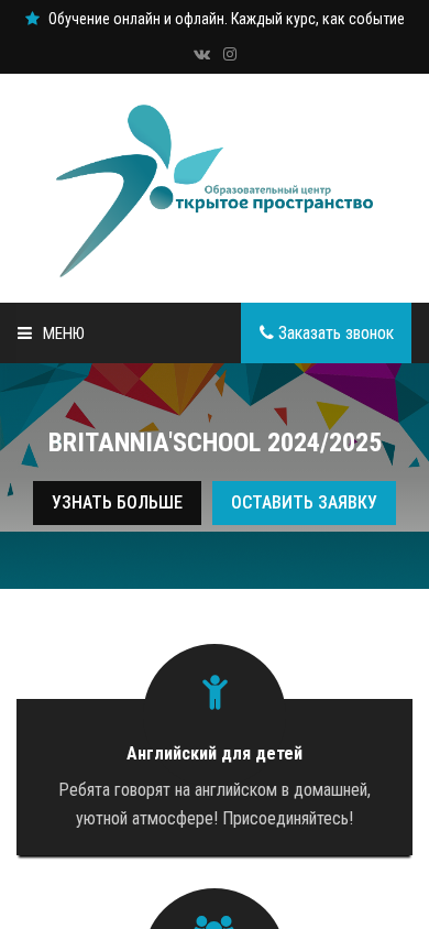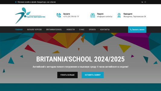 Этот онлайн-ресурс, названный "Главная | Открытое пространство", предлагает сочетание онлайн и офлайн образования. Каждый курс представлен как событие, и пользователи могут связаться по телефону +375 (29) 396-66-19 или отправить электронное сообщение на адрес info@open-center.by для получения дополнительной информации. Сайт включает разделы для взрослых курсов, образования детей и онлайн-курсов. "BriTannia'School" упоминается несколько раз, предлагая обучение английскому языку с шестью часами английского в неделю, а также основные курсы фотографии. На сайте также представлены разделы для новостей, информации о школе, оплаты и контактов. Центр "Открытое пространство" предлагает широкий спектр образовательных возможностей с использованием современных технологий, гибким расписанием и дружелюбным к детям окружением.