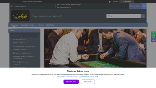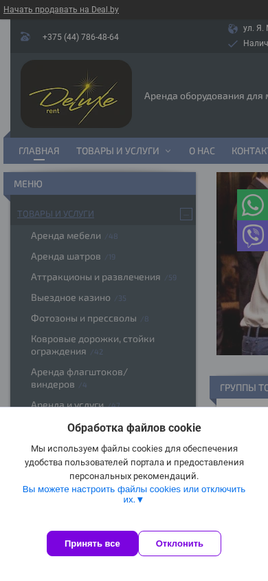 | AI-анализ | --- This website is the online presence of "ООО «Делюкс групп»," a Belarusian company that offers contacts, products, and services with prices. The main categories of goods and services include rental equipment for events, such as mezzanine floors, tents, attractions, and outdoor casinos. Other offerings include rental furniture, canopies, fencing, flagpoles, kalyan catering, lighting, sound systems, and scenic elements. Contact information, including a phone number and address in Minsk, Belarus, is provided. The website also features a shopping cart and five customer reviews. Product and rental prices are listed for various items, including a red carpet, a white tent, a giant jenga game, a carnival attraction using virtual reality technology, and a LED-lit foursquare table, among others. |